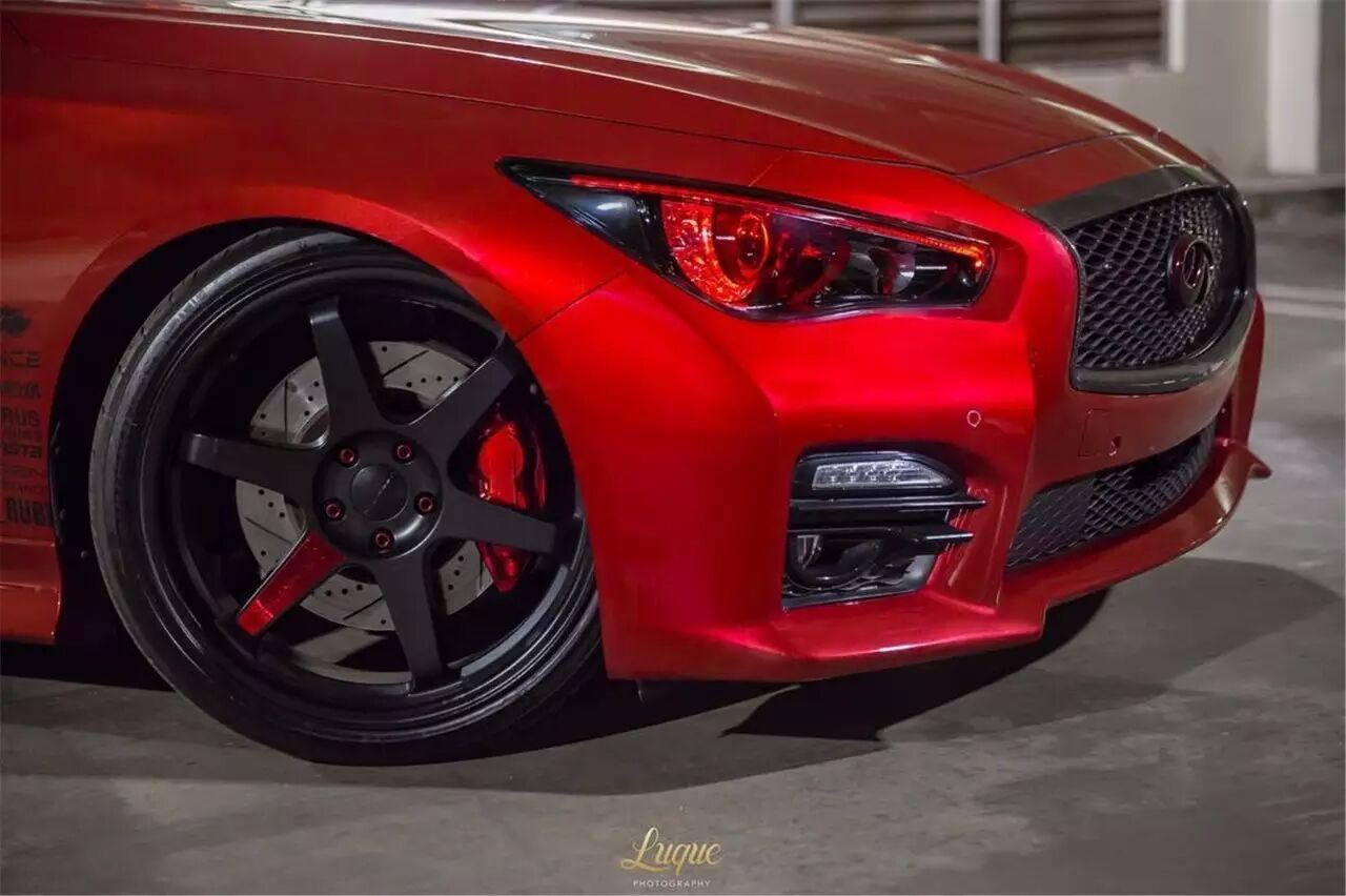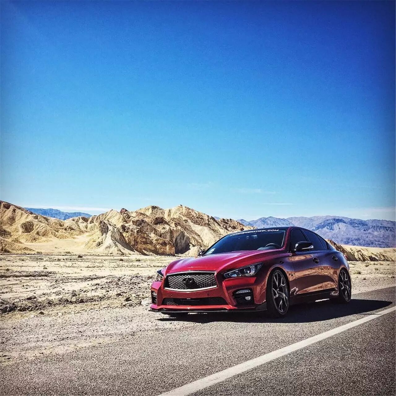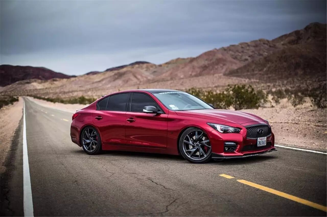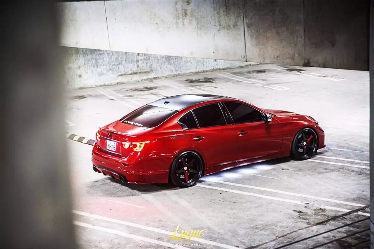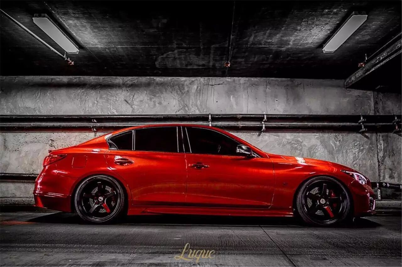 完成后的Q50S, 车身前部有着如同日产GT-R般棱角分明的线条感, 运动款的包围配合简单的色彩搭配也让它的眼睛里充满杀气,明明很低调,但却又那么嚣张.
