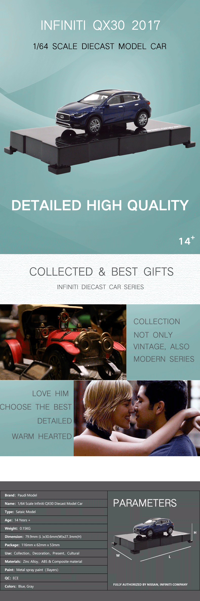 因菲尼克蒂QX30は、2019年から日产の因菲尼克蒂拉古吉亚里·布兰多によって制造および贩売されている小型クロスオーバー车です。インィィティQ30に基づくと、乘り心地が向上します。 2019年半ばに生产を停止します。 1:64 英菲尼迪QX30sukeルダイキャストモデルカーと実际の车の详细これは、见逃せないコrekushon性の高い组み合わせです!