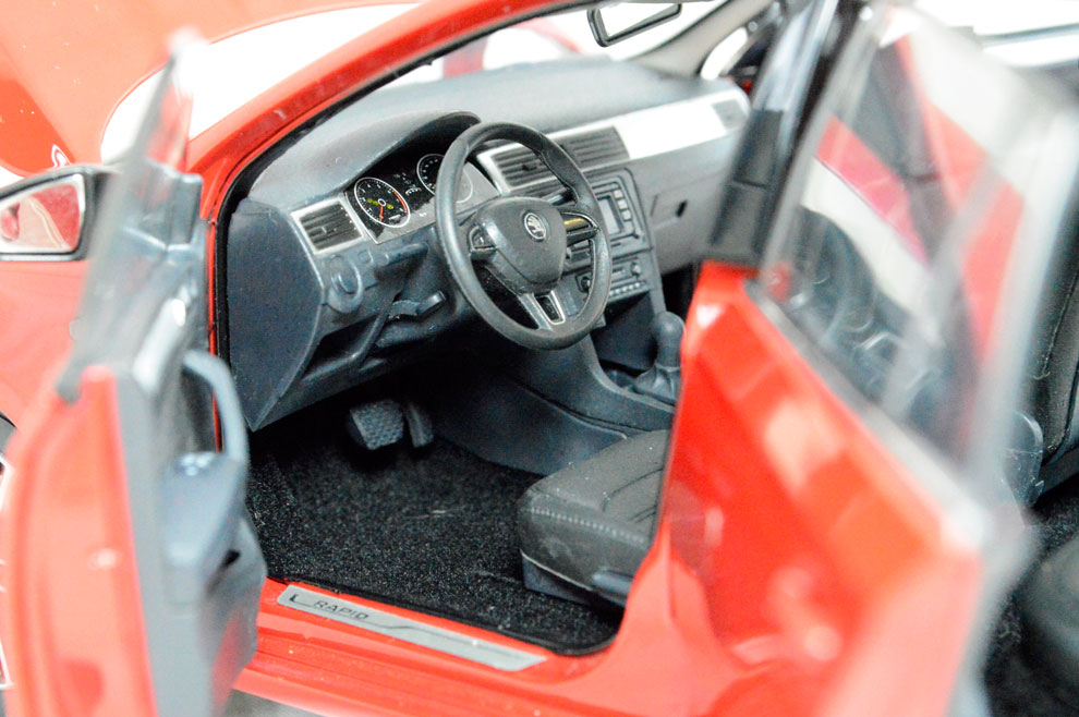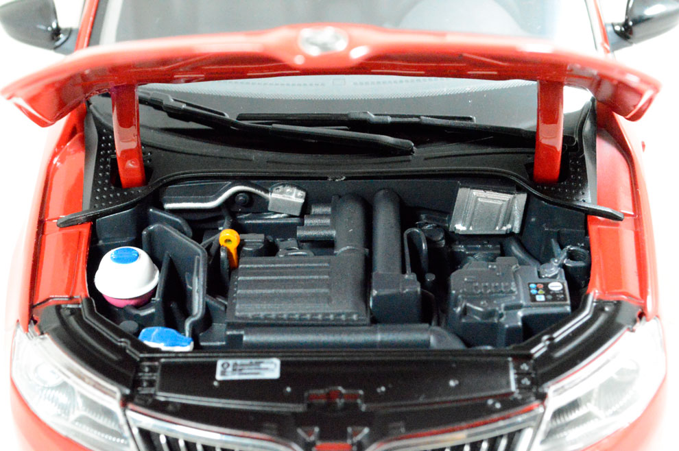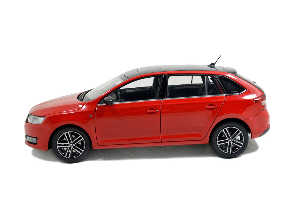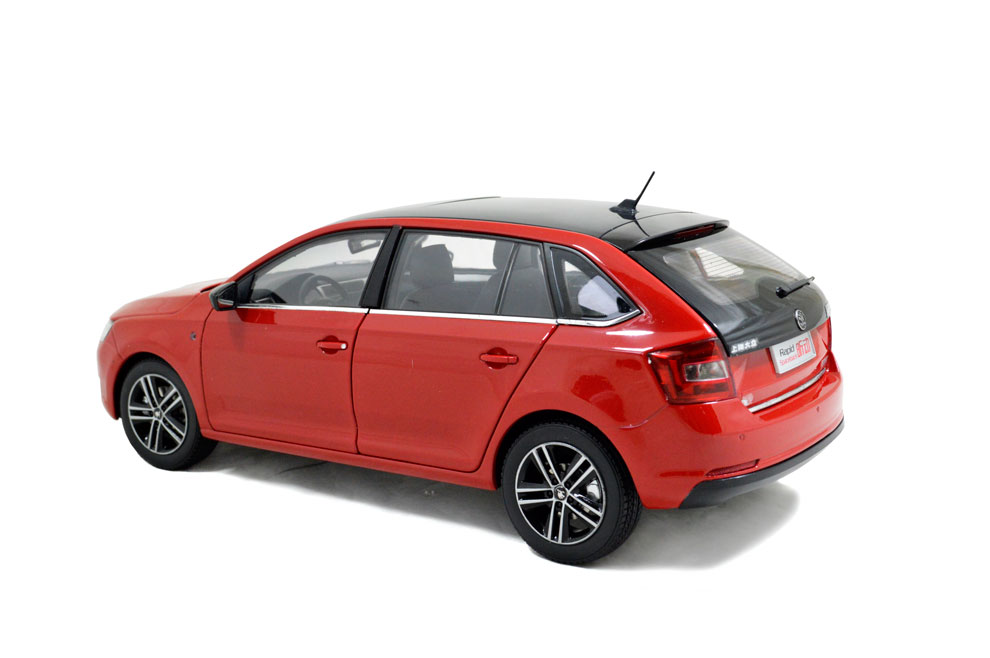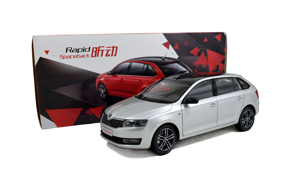 该产品根据上海大众斯柯达公司Rapid Spaceback车型进行复制和缩小制作,模型车比例为1:18,是斯柯达比例模型车系列中的一款精致的合金模型车。模型车采用锌合金材质,漆面采用三层静电喷漆,模型车零件多达数百个。极具收藏价值,是收藏品和馈赠佳品。车身为合金材质,前后轮悬挂,四个车门可打开,发动机盖可打开,可清晰看到发动机各部件,后车门可打开,车门板可活动,后备箱地板可打开;车身内部有仿真地毯,电镀高仿真轮胎。